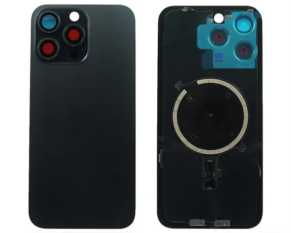 Задняя крышка (стекло) iPhone 15 Pro Max (со стеклом камеры в сборе+магнит) синий титан 1 класс