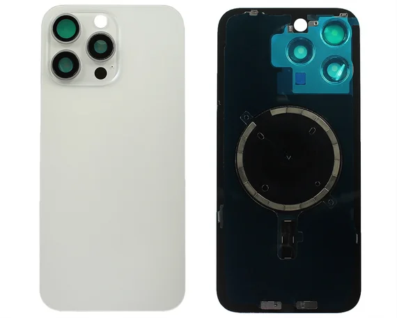 Задняя крышка (стекло) iPhone 15 Pro Max (со стеклом камеры в сборе+магнит) белый титан 1кл